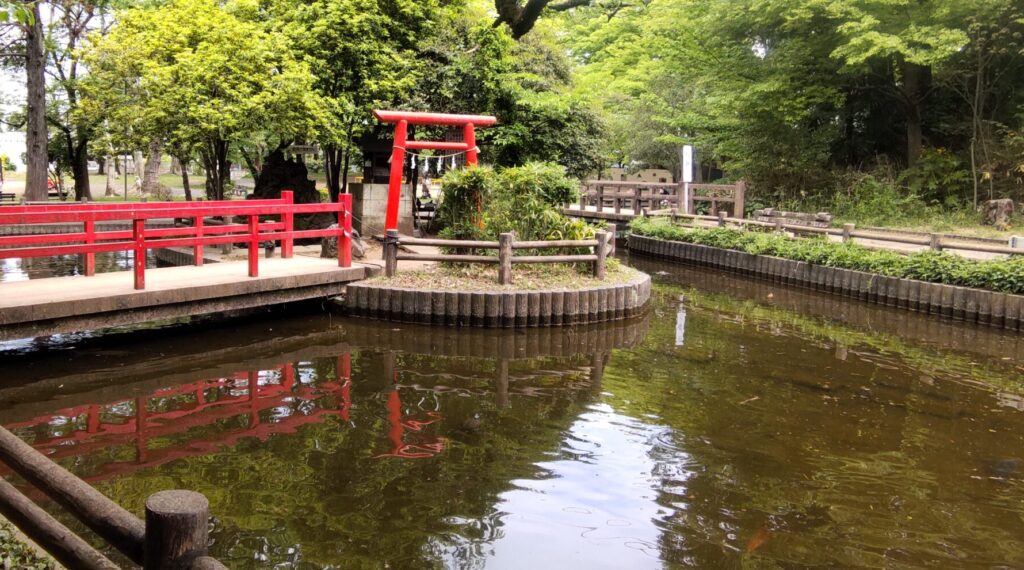 池は少し濁っていますが魚が泳いでいるところを確認でき、近くを通る際は魚が跳ねた音が聞こえてきます。池には弁天が祀られている社のようなところがあり、橋を渡ってお祈りに行くことができます。