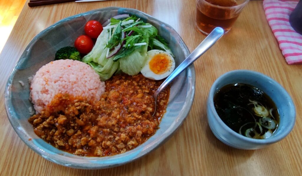 ライスは当然赤みがかっていて、色合い的には梅干しを細かくして混ぜたような風貌。トマトの皮が入っているにも関わらず、舌触り自体は白米とあまり変わらないのがうれしいです。