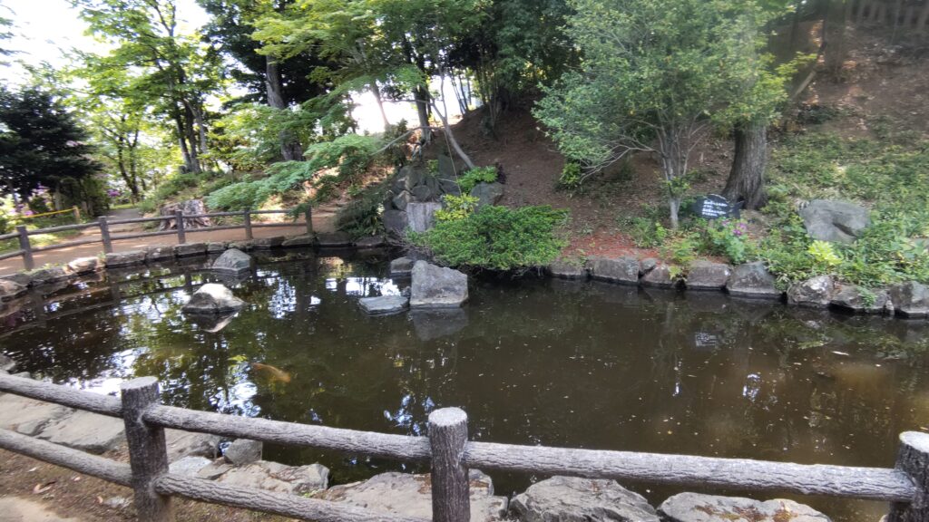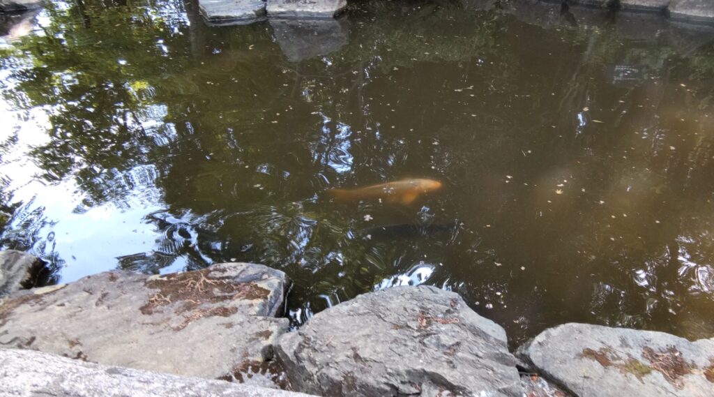 公園内には小規模の池があり、池には立派な金色や黒色の鯉が優雅に泳いでいます。またカメも生息しており、タイミングによって池から顔を出すところを観察できるでしょう。