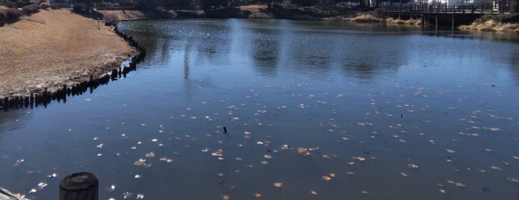 西城沼は南北に細長くとっくりのような形状で、徒歩で5分ほどで一周できるくらいの大きさです。