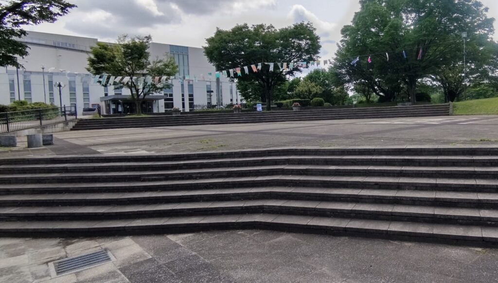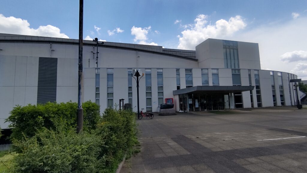 花時計があるエントランス広場の階段をあがると奥に見えてくる、多機能なスポーツ施設です。