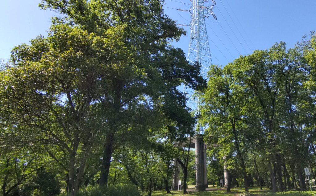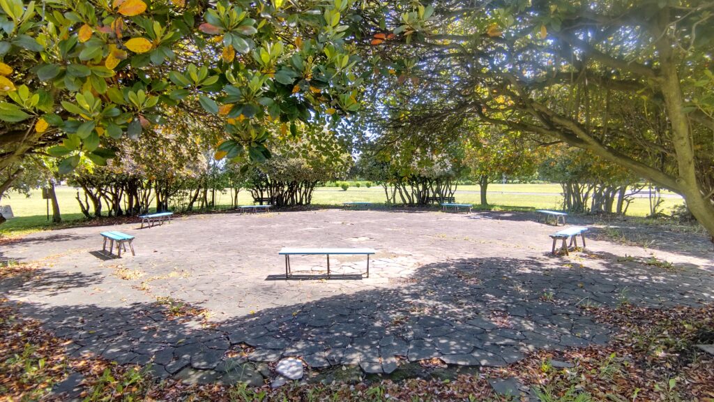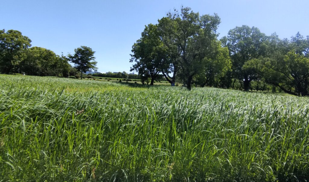 園内は幅の広い通路があり、その通路以外は芝や野草で埋め尽くされています。広々とした開放的な部分が多いですが、高木が集まり影を作っている箇所もあり影で涼むことができるでしょう。
