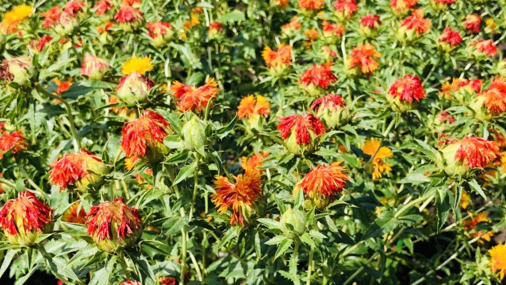 紅花は古くから染料や化粧料の原料として利用されてきたキク科の一年草で、例年6月中旬~下旬が見頃です。「べに花」は原産地の中近東からシルクロードを経て、日本に伝わったとされています。
