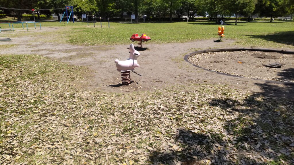 約35メートルの大型複合遊具・すべり台・ブランコ・砂場・スプリング遊具など揃っていますが、数自体は多くは無いため時として譲り合いながら利用しましょう。