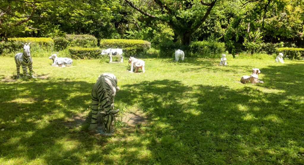 遊具と呼べるかはわかりませんが、シマウマやゾウを始めとするオブジェが複数あるのが確認できます。実際の動物ほど大きくはないですが、お子様が好きそうな遊具のため探して遊んだり写真撮影してみましょう。