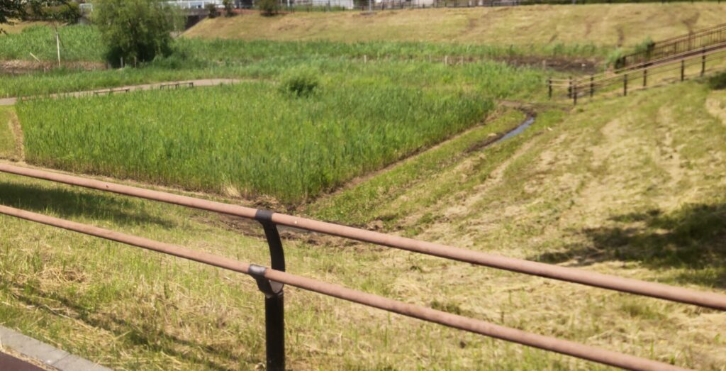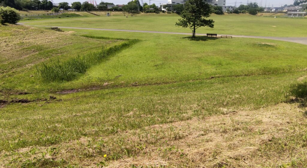 遊水地としての役割があるため、くぼんだところの広場は非常に解放感があります。