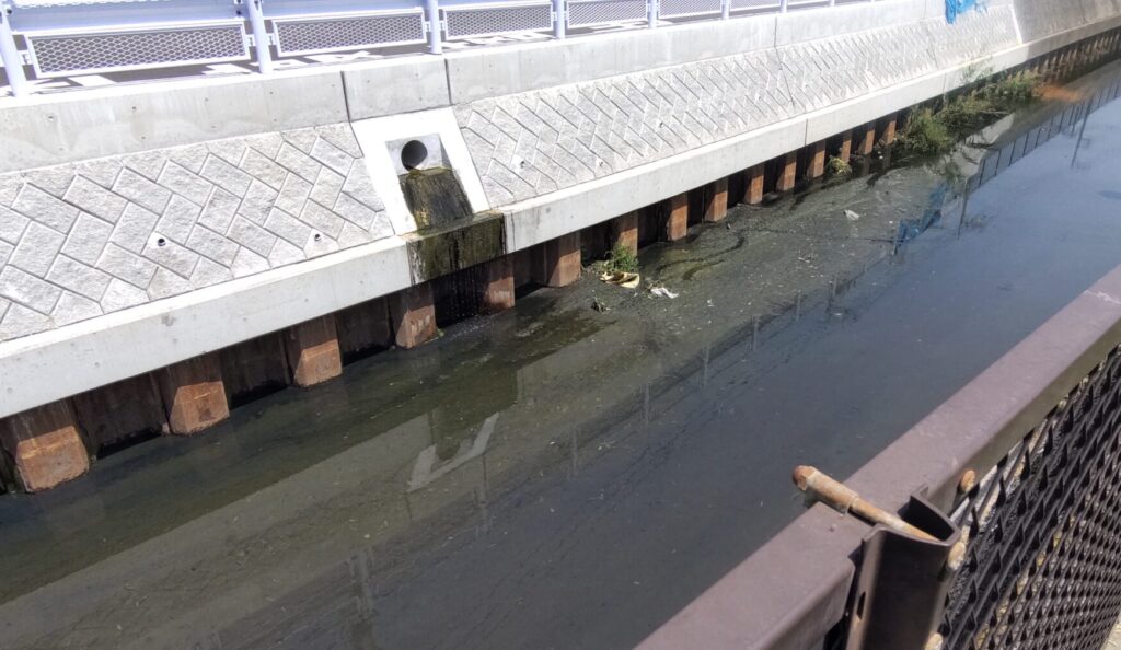 ところが、園内北側にある水路を上から覗いてみると、数多くのごみが確認できるでしょう。