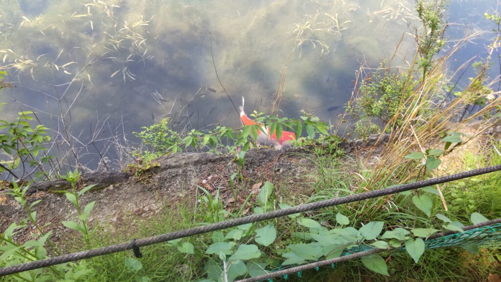 池をよく見るとニシキゴイのような魚をはじめ、小さな黒い魚影もあり近くで観察してみて下さい。