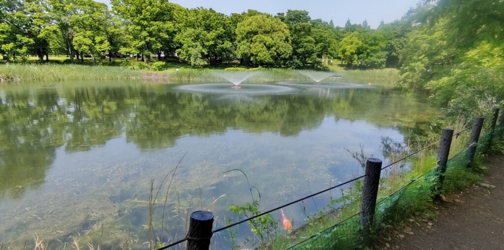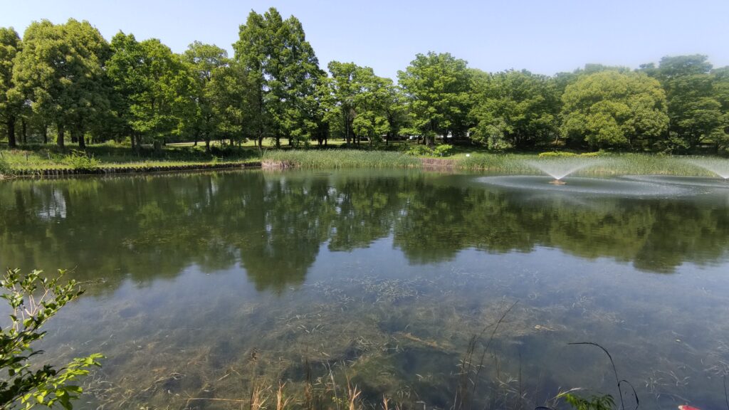 公園内のシンボル的な場所で、池は晴れていれば木々が湖面に映り、噴水によって水面が揺らぐのを楽しむことができます。