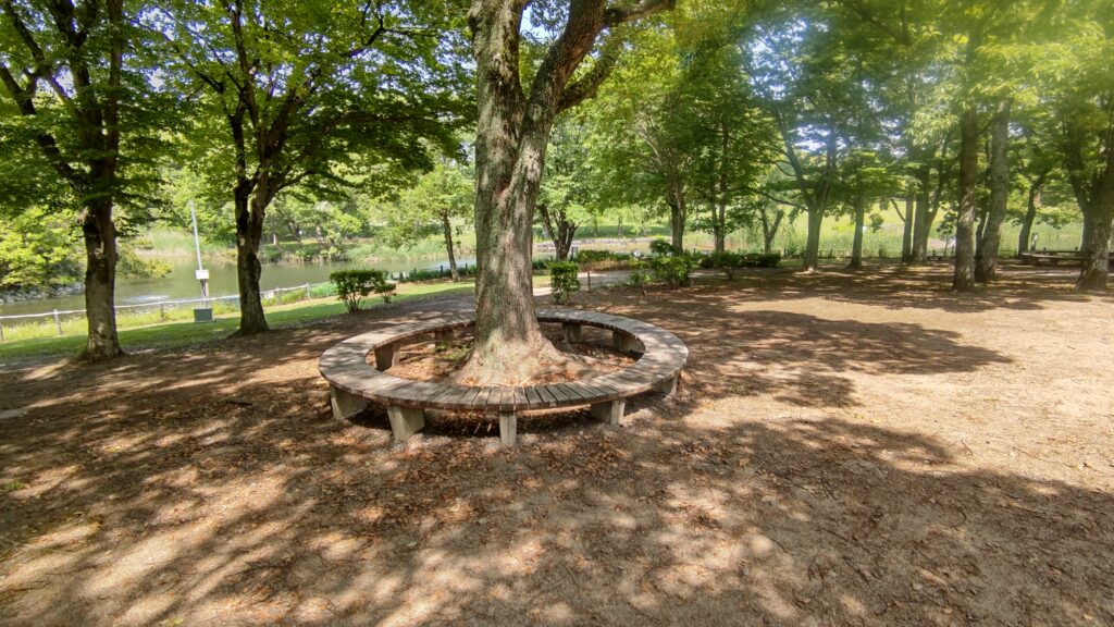 広場の周囲は木々と修景池に囲まれ、そんな環境でシートを広げてピクニックやのんびり過ごすのに最適です。