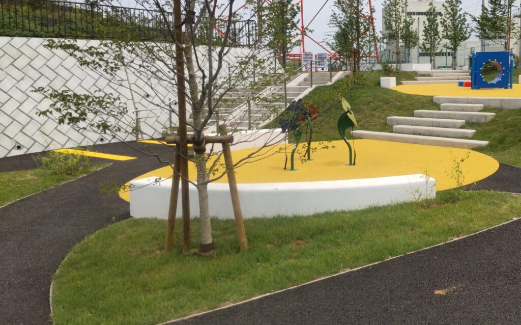 眺望の丘のすぐそばに、数は少ないですが遊具が設置されています。地面が黄色になっていて遊具もカラフルなため、美術的な景観を楽しめるでしょう。