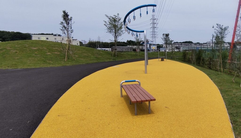 眺望の丘の下側に健康器具も設置されています。器具の下は黄色の地面のため場所はわかりやすいです。