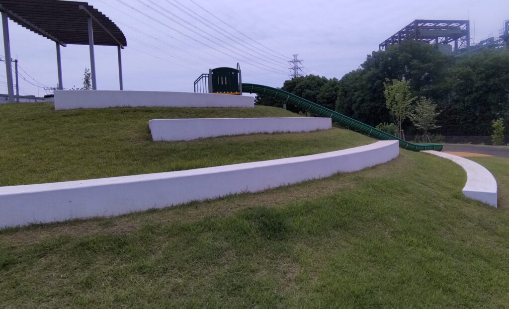 西エリアにある「夕日の丘」は、柳瀬川の側にある小さな丘のあるエリアです。このエリアには緑色のスライダーが設置され、丘の上から丘の下へ滑ることができます。