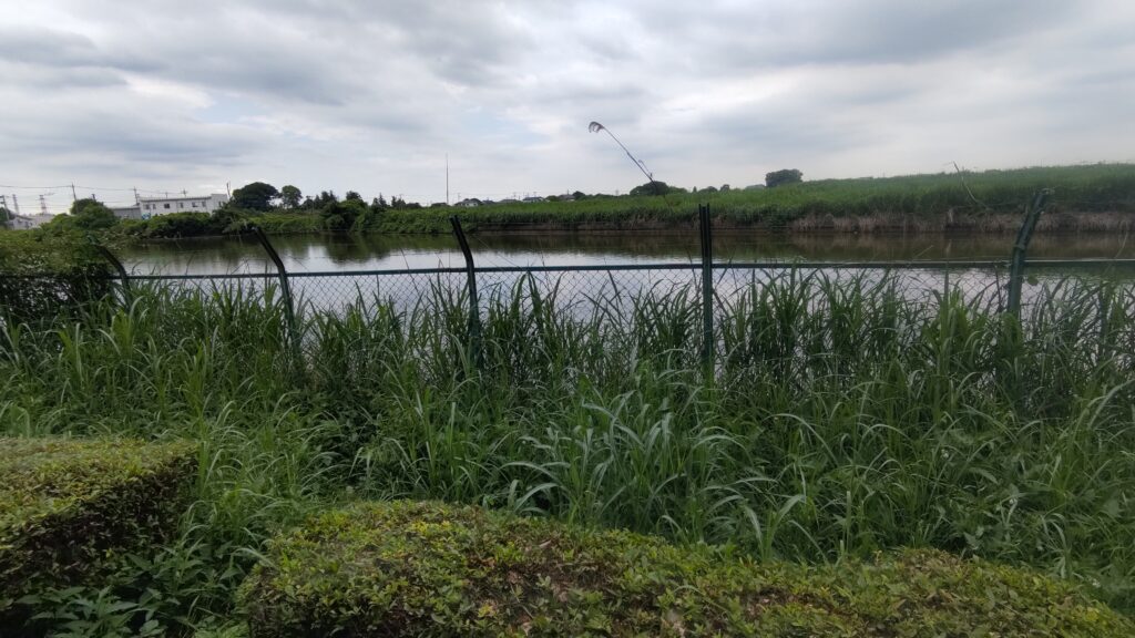 公園の南側の健康器具エリア付近から「調整池」を見ることができます。中に入ることはできませんが、大雨などの際に洪水で冠水を防ぐなど防災面で役立つ池です。