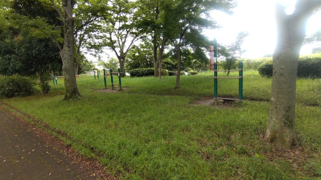 園内南側には健康器具が複数設置されており、草木に囲まれた環境で健康の保持ができます。健康器具は一カ所に固まっているため、色々な種類を利用しやすいです。