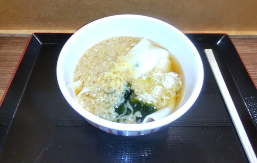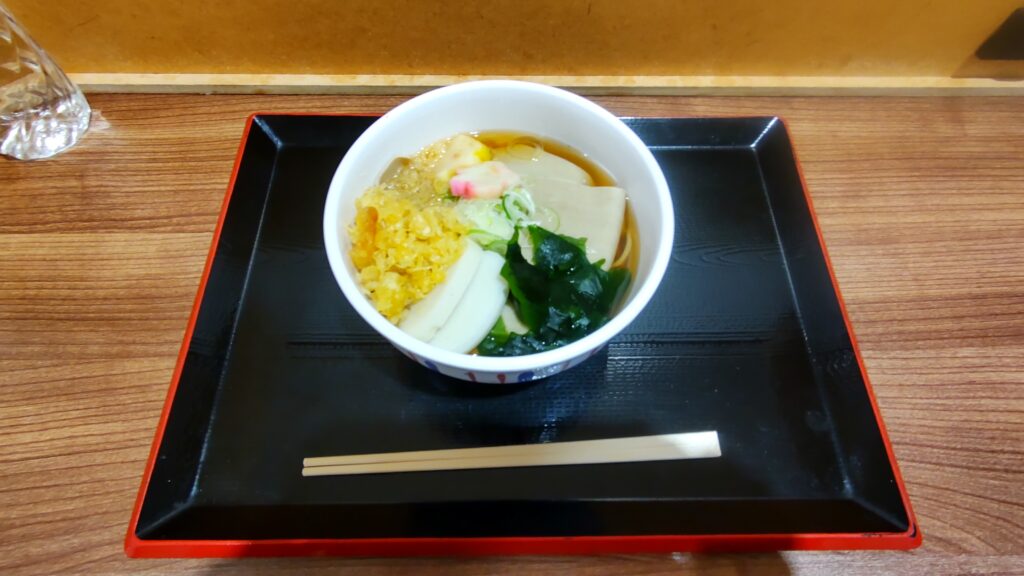 まずはじめに案内するのは、「川幅うどん」です。うどん・揚げ玉・かまぼこ・わかめ・ネギが入っており、特に揚げ玉の量がかなり多い印象を受けます。