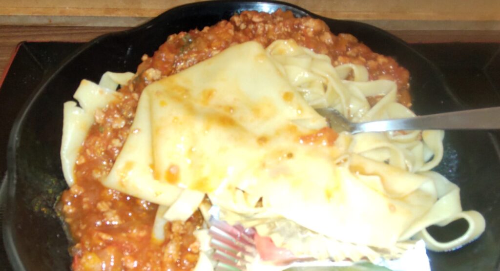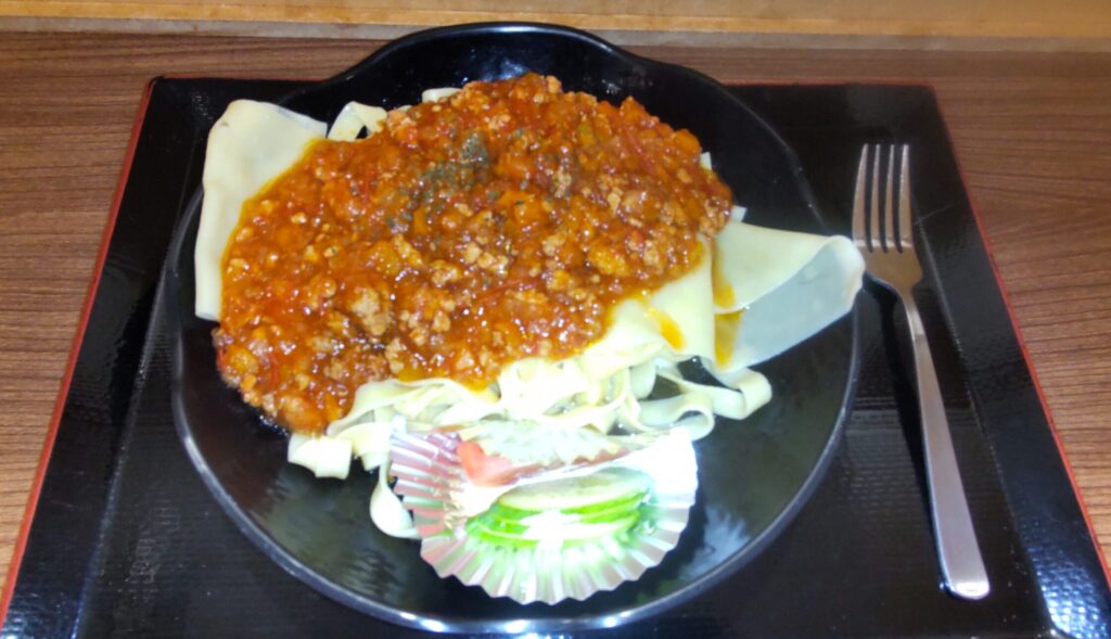 ソースに隠れてわかりにくいですが、川幅日本一にちなんだ太い麺は1枚だけです。太い麺と他の麺は薄いため、麺がミートソースによくからみます。