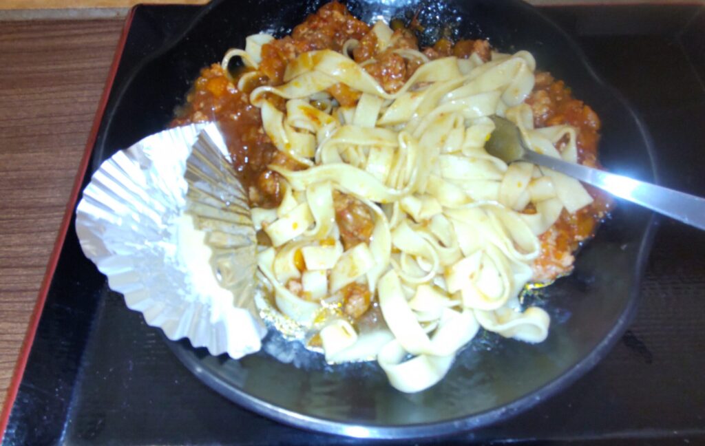 太い麺は少し食べにくく、ミートソースがかからないように注意して完食しましょう。