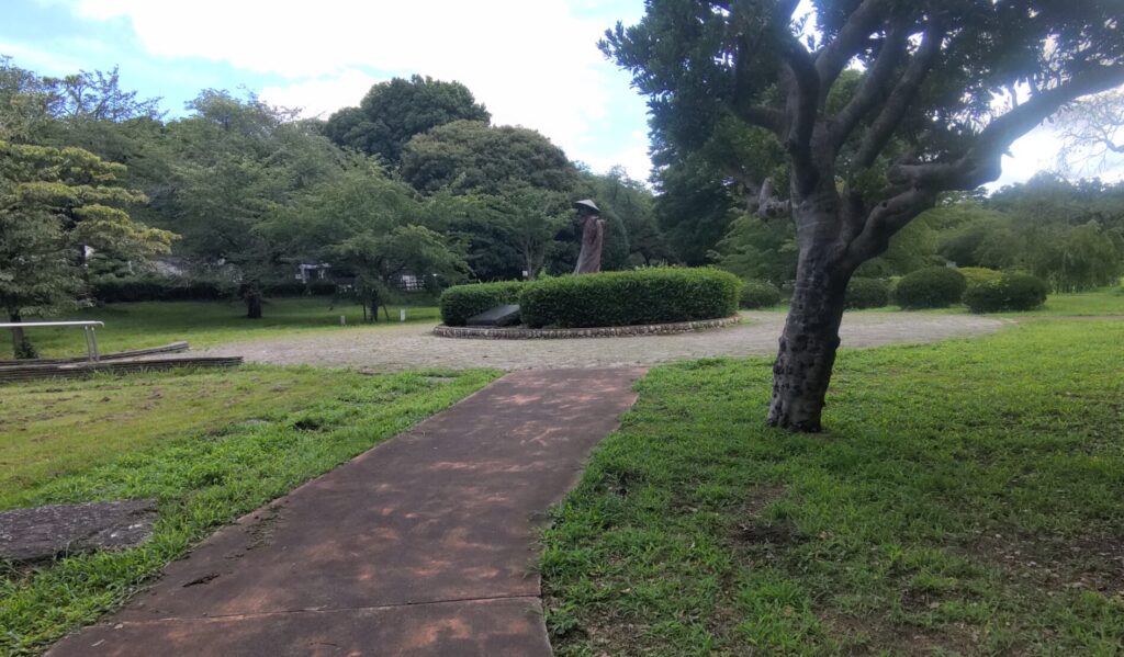 「武笠三(むかささん)」が見沼の風景からヒントを得て、「案山子」という曲の歌詞を書きました。それをたたえて案山子の像が設立され、公園のシンボルになっています。