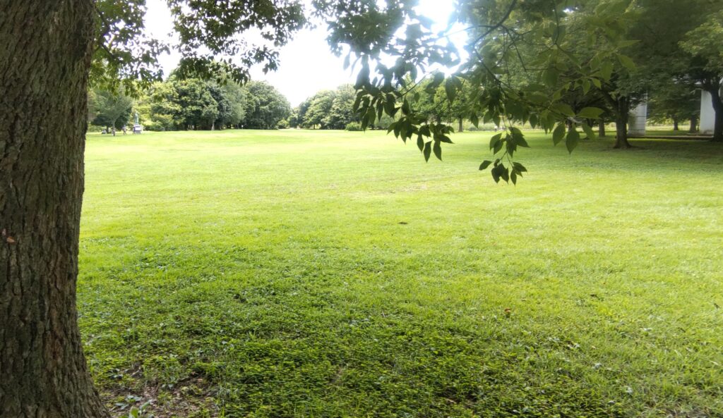 園内北側にある「芝生広場」は、非常に開放的なエリアとなっています。池に隣接しており、広々した広場とその周囲は自然で埋め尽くされている空間です。